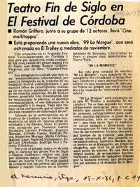 Teatro 'Fin de siglo' en el Festival de Córdoba [artículo]. El Mercurio (Santiago). -- oct. 15, 1986, p. C14 .