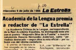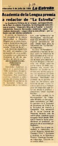 Academia de la Lengua premia a redactor de "La Estrella" [artículo]. La Estrella (Valparaíso). -- jul. 9, 1986, p. 10 .