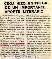 CEOJ hizo entrega de un importante aporte literario [artículo]. La Mañana. -- jun. 17, 1986, p. 3. .