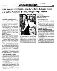 Una "requetecomedia", con la vedette Liliana Ross y la actriz Cristina Tocco, dirige Hugo Miller [artículo] / Amparo Lavín A. La Segunda (Diario : Santiago, Chile)-- dic. 1, 1989, p. 55 retr. .