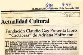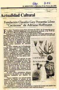 Fundación Claudio Gay presenta libro "Cactáceas" de Adriana Hoffmann [artículo]. El Mercurio (Santiago). -- ene. 16, 1990, p. A4 .