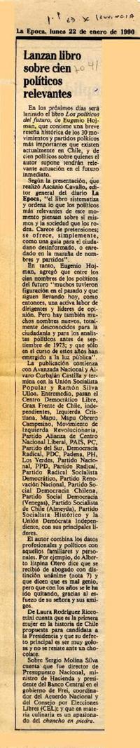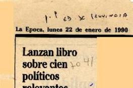 Lanzan libro sobre cien políticos relevantes [artículo]. La Epoca. -- Ed. de Provincia. -- ene. 22, 1990, p. 9. .