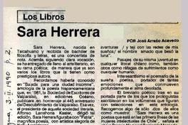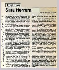 Sara Herrera, "Antología poética" [artículo] / José Arraño Acevedo. La Tribuna (Diario : Los Angeles, Chile)-- ene. 13, 1990, p. 3. Atacama (Diario : Copiapó, Chile)-- ene. 17, 1990, p. 2. El Rancagüino (Diario : Rancagua, Chile)-- feb. 3, 1990, p. 2. .