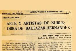 Arte y artistas de Ñuble, obra de Baltazar Hernández [artículo] / Miguel Angel Roa Rioseco. Renacer de Chile. -- feb. 16, 1990, p. 3. .