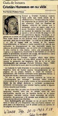 Cristián Huneeus en su vida [artículo] / Hernán Poblete Varas. La Tercera. -- abr. 20, 1986, p. 18 (segundo cuerpo) retr. .