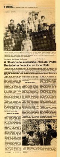 A 34 años de su muerte, obra del Padre Hurtado ha florecido en todo Chile [artículo]. Crónica. -- ago. 18, 1986, p. 4. retr. .