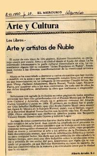 Arte y artistas de Ñuble [artículo] / Alberto Arraño. El Mercurio (Diario : Valparaiso, Chile)-- jun. 28, 1990, p. 10. La Discusión-- jun. 29, 1990, p. 2. La Prensa (Diario : Curico, Chile)-- jul. 4, 1990, p. 5. La Tribuna (Diario : Los Angeles, Chile)-- jul. 11, 1990, p. 3. El Mercurio (Diario : Antofagasta, Chile)-- ago. 2, 1990,p. 2. El Mercurio (Diario : Calama, Chile)-- ago. 2, 1990, p. 2. .