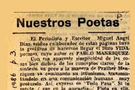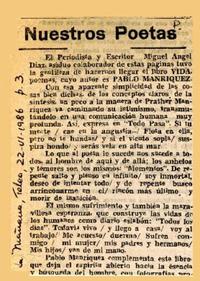 Nuestros poetas [artículo] / P. La Mañana. -- jun. 22, 1986, p. 3. .