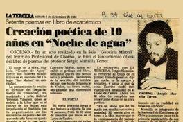 Creación poética de 10 años en "Noche de agua" [artículo]. La Tercera. -- Ed. de provincia. -- dic. 6, 1986, p. 39 retr. .