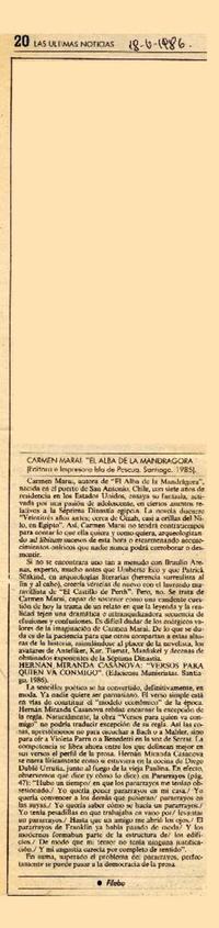 Carmen Marai, "El alba de la Madrágona" [artículo] / Filebo. Las Últimas Noticias (Diario : Santiago, Chile)-- mayo 18, 1986, p. 20. 1 página : ilustración en blanco y negro ; 32 cm. .