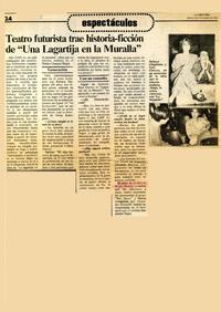 Teatro futurista trae historia-ficción de "Una lagartija en la muralla" [artículo]. La Segunda (Diario : Santiago, Chile)-- nov. 20, 1986, p. 24 .