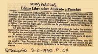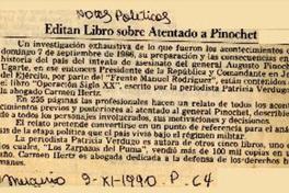 Editan libro sobre atentado a Pinochet [artículo]. El Mercurio (Santiago). -- nov. 9, 1990, p. C4 .