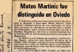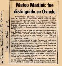 Mateo Martinic fue distinguido en Oviedo [artículo]. La Prensa Austral. -- jun. 30, 1986, p. 4. .