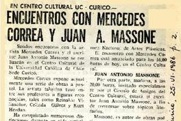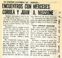 Encuentros con Mercedes Correa y Juan A. Massone [artículo]. La Prensa (Curicó). -- jun. 25, 1986, p. 2. .