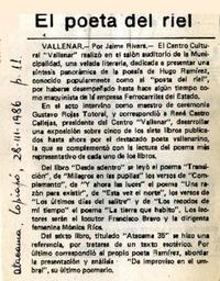 El poeta del riel [artículo] / Jaime Rivera. Atacama. -- mar. 28, 1986, p. 11 .