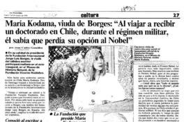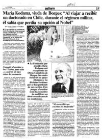 María Kodama, viuda de Borges, "Al viajar a recibir un doctorado en Chile, durante el régimen militar, él sabía que perdía su opción al Nobel [artículo] / Juan Carlos González. La Segunda (Diario : Santiago, Chile)-- dic. 2, 1991, p. 27 retr. .