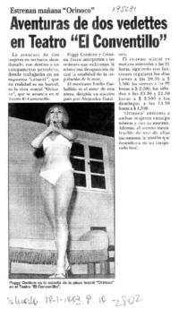 Aventuras de dos vedettes en Teatro "El Conventillo". [artículo] La Cuarta (Diario : Santiago, Chile)-- ene. 19, 1993, p. 19. .
