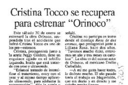 Cristina Tocco se recupera para estrenar "Orinoco" [artículo]. La Epoca. -- ene. 27, 1993, p. 34 .