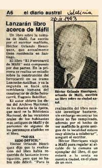 Lanzarán libro acerca de Máfil [artículo]. El Diario Austral (Valdivia). -- mar. 26, 1993, p. A6 retr. .