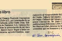 Presentación de libro [artículo] / Juan A. Hernández Aguayo. El Sur (Diario : Concepción, Chile)-- ene. 6, 1987, p. 2. .