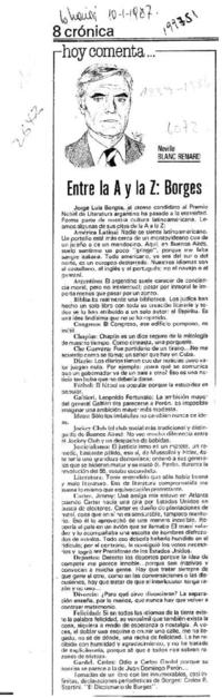 Entre la A y la Z Borges [artículo] / Neville Blanc Renard. La Nación. -- ene. 10, 1987, p. 8. retr. .