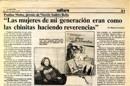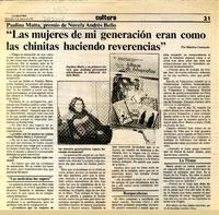"Las mujeres de mi generación eran como las chinitas haciendo reverencias" [artículo] / Mariluz Contardo. La Segunda (Diario : Santiago, Chile)-- ago. 12, 1987, p. 21 retr. .