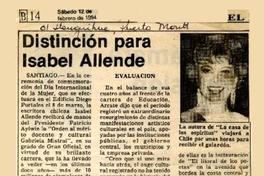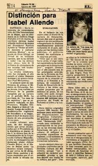 Distinción para Isabel Allende [artículo] El Llanquihue (Diario : Puerto Montt, Chile)-- feb. 12, 1994, p. B14 retr. .