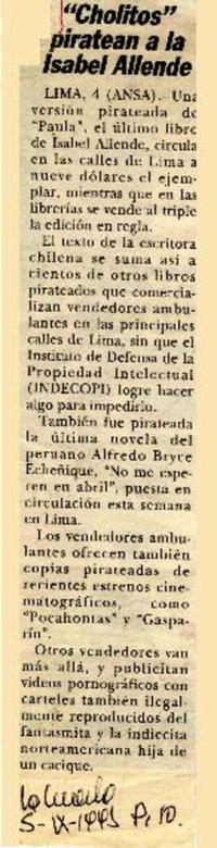 "Cholitos" piratean a la Isabel Allende. [artículo] La Cuarta (Diario : Santiago, Chile)-- sept. 5, 1995, p. 10. .