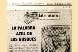 La palabra azul de los bosques. [artículo] El Diario Austral (Valdivia, Chile)-- jun. 12, 2003, p. A8. il. .