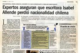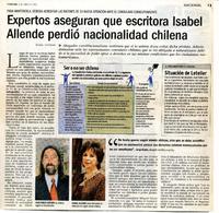 Expertos aseguran que escritora Isabel Allende perdió nacionalidad chilena [artículo] / Isabel Guzmán. La Tercera (Diario : Santiago, Chile)-- jun. 5, 2003, p. 13. .