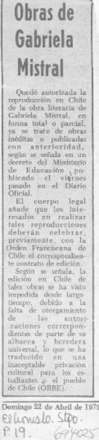 Obras de Gabriela Mistral. [artículo] El Cronista (Santiago, Chile)-- abr. 22, 1979, p. 19. .