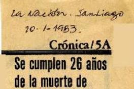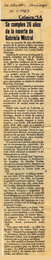Se cumplen 26 años de la muerte de Gabriela Mistral. [artículo] La Nación (Santiago, Chile)-- ene. 10, 1983, p. A5. .