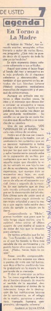 En torno a la madre [artículo] / Gabriela Silva Ossa. Las Últimas Noticias (Diario : Santiago, Chile)-- dic. 16, 1981, p. 7. .