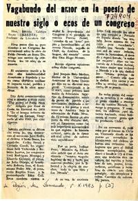 Vagabundo del amor en la poesía de nuestro siglo o ecos de un congreso [artículo] / Hernán Cabrera Baeza. La Región (San Fernando, Chile)-- oct. 1, 1983, p. [3]. .