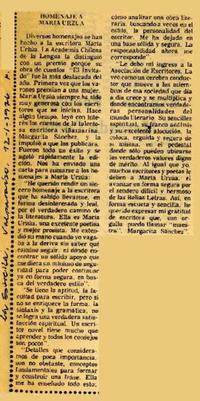 Homenaje a María Urzúa. [artículo] La Estrella (Valparaíso, Chile)-- ene. 12, 1976, p. 5. .