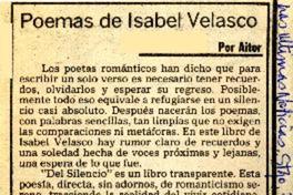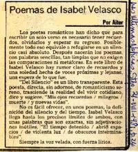 Poemas de Isabel Velasco [artículo] / Aitor. Las Últimas Noticias (Diario : Santiago, Chile)-- ago. 21, 1981, p. 24. .