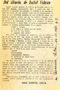 Del silencio, de Isabel Velasco [artículo] / Juan Gabriel Araya G. La Discusión (Chillán, Chile)-- jun. 22, 1981, p. 3. .