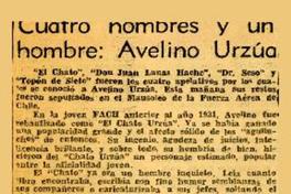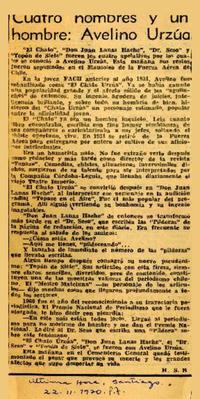 Cuatro nombres y un hombre: Avelino Urzúa [artículo] / H. S. R. Ultima Hora (Diario : Santiago, Chile)-- feb. 22, 1970, p. 7. .