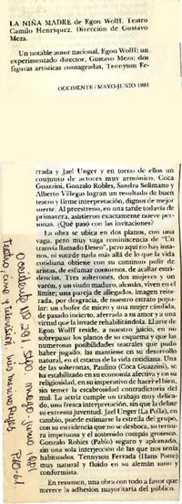 La niña madre [artículo] / Luis Merino Reyes. Occidente (Santiago, Chile)-- no. 291 (mayo-jun. 1981) p. 60-61. .