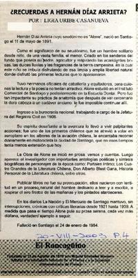 ¿Recuerdas a Hernán Díaz Arrieta? [artículo] / Ligia Uribe Casanueva. El Rancagüino (Diario : Rancagua, Chile)-- ago. 20, 2003, p. 4. .
