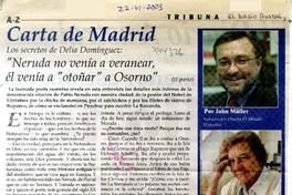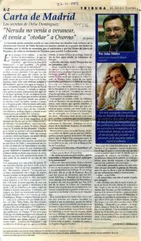 Carta de Madrid. Los secretos de Delia Domínguez. Neruda no venía a veranear, él venía a otoñar a Osorno : [entrevistas] [artículo] John Müller.