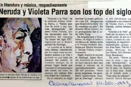 Neruda y Violeta Parra son los Top del siglo [artículo]. Crónica (Diario : Concepción, Chile)-- ago. 14, 1999, p. 24. .