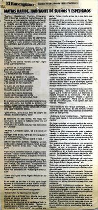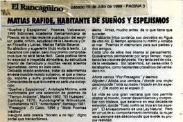 Matías Rafide, habitante de sueños y espejismos [artículo]. El Rancagüino (Diario : Rancagua, Chile)-- jul. 10, 1999, p. 3. .