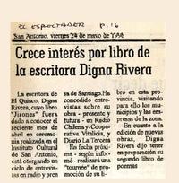 Crece interés por libro de la escritora Digna Rivera [artículo] El Espectador (Diario : San Antonio, Chile) mayo 24, 1996, p. 16. .