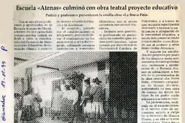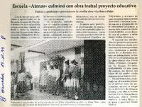 Escuela "Atenas" culminó con obra teatral proyecto educativo [artículo]. El Observador (Diario : Quillota, Chile)-- nov. 19, 1999, p. D. .