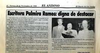 Escritora Palmira Ramos : digna de destacar [artículo] / Aníbal López Saavedra. El Andino (Diario : Los Andes, Chile)-- nov. 26, 1999, p. 10. .