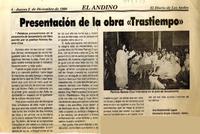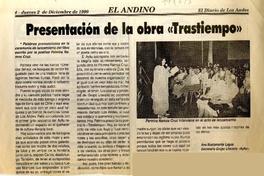 Presentación de la obra "Trastiempo" [artículo] / Ana Bustamante. El Andino (Diario : Los Andes, Chile)-- dic. 2, 1999, p. 4. .