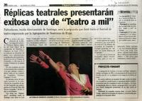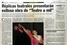 Réplicas teatrales presentarán exitosa obra de "Teatro a mil" [artículo]. El Día (Diario : La Serena, Chile)-- ene. 14, 2004, p. 26. .