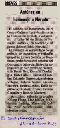Antúnez en homenaje a Neruda [artículo] El Sur (Diario : Concepción, Chile)-- ene. 12, 2004, p. 23. .