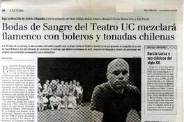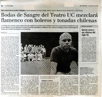 Bodas de Sangre del teatro UC mezclará flamenco con boleros y tonadas chilenas [artículo] / Manuela Silva. La Tercera (Diario : Santiago, Chile)-- mar. 8, 2004, p. 36. .
